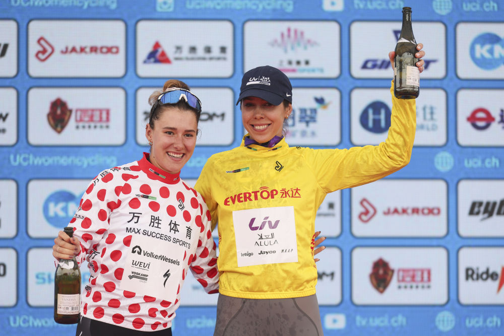10月14日,身著代表爬坡總積分第一名的圓點衫的安妮·克妮珍寶(左)和身著代表個人總成績第一名的黃衫的貝克在頒獎儀式上慶祝。新華社記者 王翔 攝