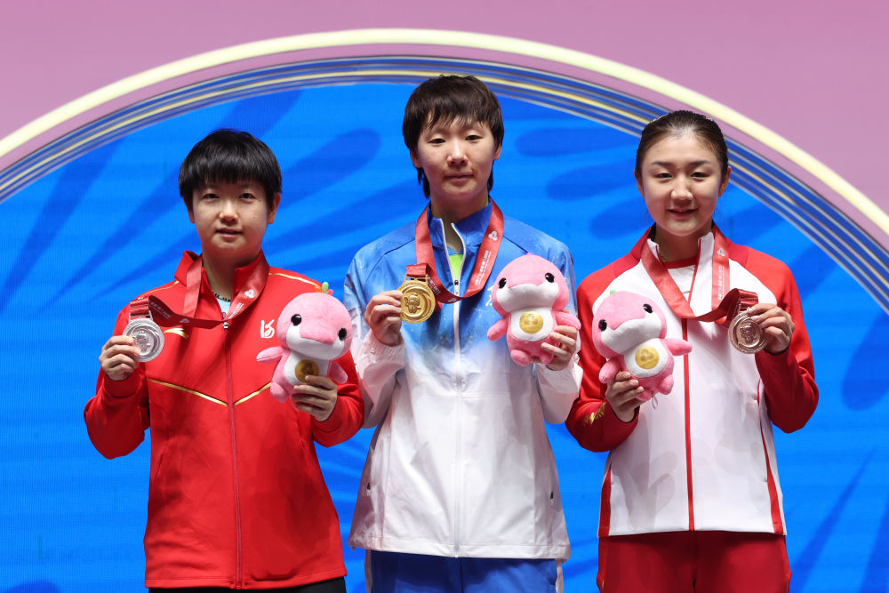 11月16日,冠軍黑龍江隊選手王曼昱(中)、亞軍河北隊選手孫穎莎(左)和季軍山東隊選手陳夢在頒獎儀式上合影。新華社記者 梁旭 攝