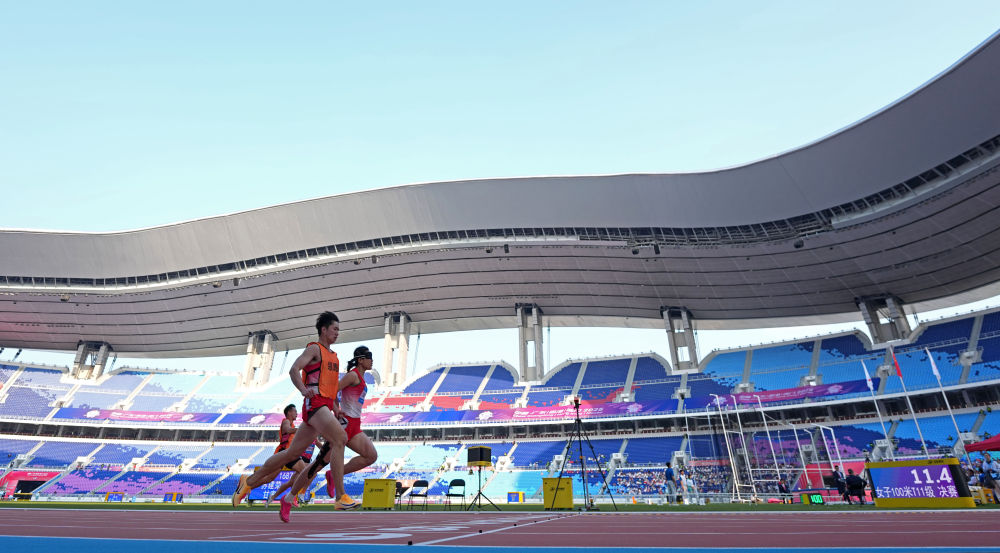 當(dāng)日,伴隨著提振人心的醒獅表演,田徑、聾人籃球等項(xiàng)目都在簡(jiǎn)短的開賽儀式后進(jìn)入競(jìng)賽環(huán)節(jié)。在廣東省奧體中心體育場(chǎng)舉行的田徑比賽傳來捷報(bào),巴黎殘奧會(huì)兩銀得主、山東選手郭芊芊在女子400米T35級(jí)比賽中,以超世界紀(jì)錄、破全國紀(jì)錄的1分14秒65率先沖線。兩屆殘奧會(huì)冠軍、陜西隊(duì)的董飛霞在女子鉛球F55級(jí)比賽中摘下桂冠。在她的鼓勵(lì)下,陜西隊(duì)當(dāng)天一共獲得6枚田徑金牌。