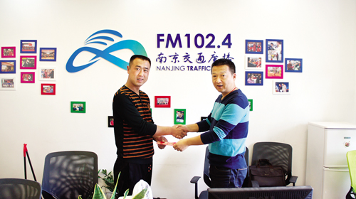 4月7日,在南京交通廣播“智勇在線”節(jié)目組,來自忻州市定襄縣的智杰(左)和主持人智勇在一起,并受到了該媒體的贊譽與獎勵(劉捷 攝)