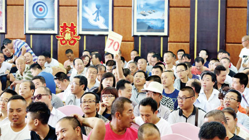 拍賣會上,每輛車的照片、車況、實時價格都出現(xiàn)在了大屏幕上,眾多競拍者頻頻舉牌,隨著拍賣師的一次次落槌,一輛輛公車依序被成功拍賣。(實習(xí)記者 郭浩東 攝)