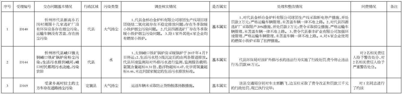 我市高度重視,立即組織查處,截至5月4日,督辦的3件群眾反映問題已辦結。其中,代縣確認基本屬實的2件;定襄縣確認屬實的1件。對于屬實已辦結的環(huán)保問題,分別采取了相應處理措施,其中限產(chǎn)停產(chǎn)1件2家、查封扣押1件5家、罰款92.6萬元;目前,代縣對2名相關責任人給予警告處分、2名相關責任人給予嚴重警告處分;定襄縣對1名相關責任人進行了約談;對3件群眾反應問題調查處理情況進行了信息公開。