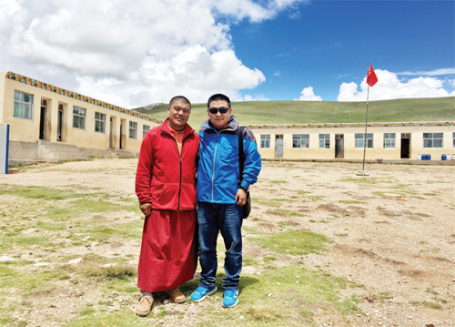 在青海玉樹念經湖小學慈善捐贈后與校長合影留念