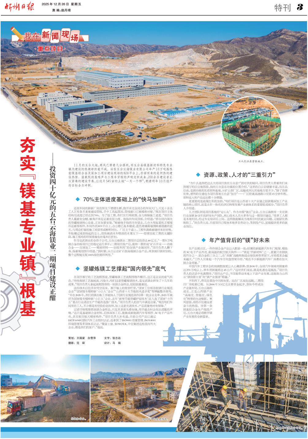 夕陽(yáng)西下,焊花在暮色中閃爍如星。站在廠區(qū)高處遠(yuǎn)眺,二期項(xiàng)目廠房輪廓已現(xiàn)。從2006年3.5億元注冊(cè)資金起步,到如今形成全產(chǎn)業(yè)鏈布局,五臺(tái)云海的成長(zhǎng),正是山西鎂產(chǎn)業(yè)“高端化、智能化、綠色化”轉(zhuǎn)型的生動(dòng)縮影。寒風(fēng)瑟瑟,卻擋不住建設(shè)者奮斗的熱情。待第一條鎂基輕合金生產(chǎn)線投產(chǎn)后,五臺(tái)大地必將掀開(kāi)鎂產(chǎn)業(yè)發(fā)展的全新篇章。