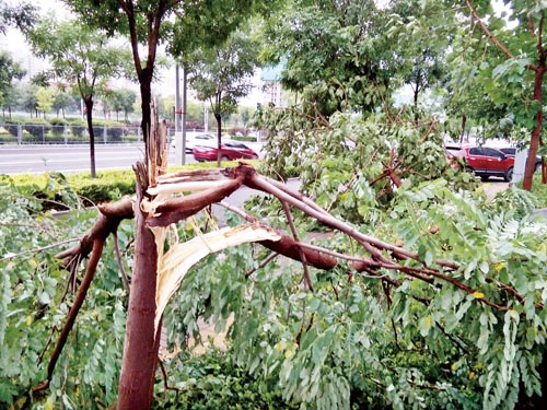 7月15日下午,忻州城區(qū)遭遇一場突如其來的暴風(fēng)雨襲擊,致使局部地區(qū)出現(xiàn)樹木被刮倒、樹枝被折斷、車輛被劃傷的現(xiàn)象。圖為忻州城區(qū)惠民小區(qū)院外道路邊的景觀樹被刮折。(魯明強(qiáng) 攝)