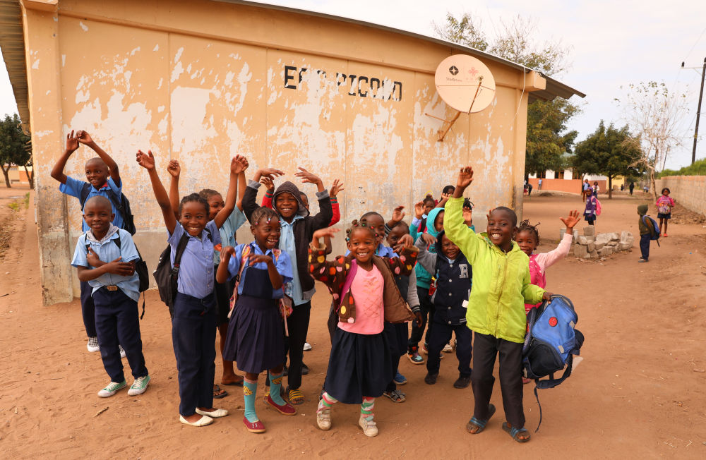 2023年7月25日,莫桑比克馬普托省皮科科村學校的孩子們站在裝有中國援助的衛(wèi)星電視接收天線的房屋前?!叭f村通”項目旨在為非洲國家的1萬個村莊接入衛(wèi)星數(shù)字電視信號,項目2018年在莫桑比克啟動,為該國1000個村落、2萬戶家庭和3000個公共場所安裝衛(wèi)星電視設備,提供電視信號和節(jié)目,覆蓋農(nóng)村人口達250萬。新華社記者 董江輝 攝