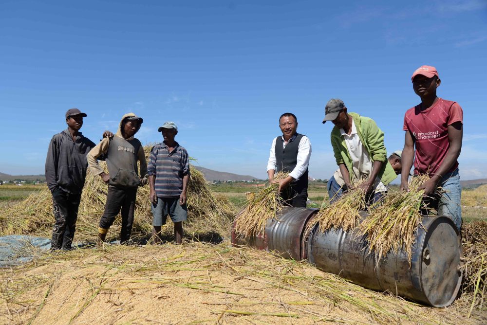 在馬達加斯加首都塔那那利佛附近的馬義奇鎮(zhèn),中國雜交水稻技術專家胡月舫(右三)在中國國家雜交水稻工程技術研究中心非洲分中心的試驗田里和當?shù)剞r(nóng)民一起收獲水稻(2023年5月12日攝)。新華社發(fā)(西塔卡·拉喬納里松 攝)