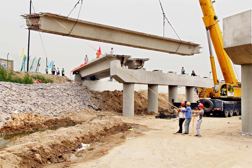 據(jù)了解,牧馬河大橋自開工以來,承擔大橋施工任務的太原市政總公司的建設者們?yōu)楸4髽蚰馨磿r、按質(zhì)、按量建成而日夜奮戰(zhàn),每天投入100多個工人,分“ 三班”倒施工。據(jù)介紹,目前,大橋進入橋面鋪設階段,工人們每天幾乎進行的是水、陸、空立體施工。從25日一早開始,1臺大型拖車將1公里外預制的箱梁運來,1臺大型吊車每天張開巨大吊臂在高空輸送箱梁,每個箱梁長為20米、重約60噸,整個橋面共由70塊箱梁組成。據(jù)現(xiàn)場施工技術人員介紹,過去的牧馬河橋長130米,寬僅有8.5米,嚴重制約著南北向車輛通行。新建的大橋長為140米,7跨30米寬,設計為雙向四車道。