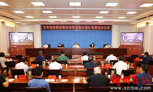 全市加快促進(jìn)服務(wù)業(yè)恢復(fù)穩(wěn)定增長(zhǎng)電視電話會(huì)議。范濤 攝