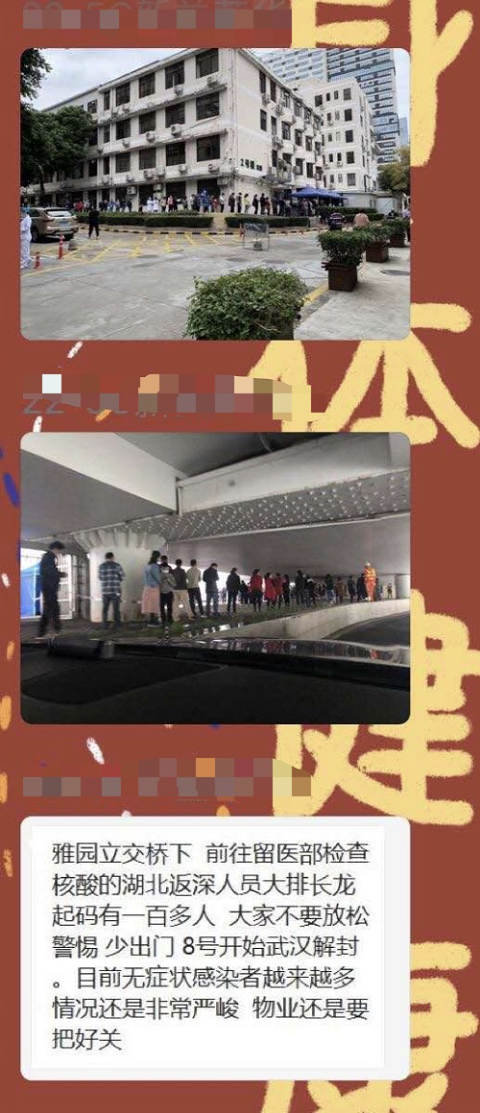 “雅園立交橋下,前往留醫(yī)部檢查核酸的湖北返深人員大排長(zhǎng)龍,起碼有一百人,大家不要放松警惕,少出門?!?日,這段文字和兩張大排長(zhǎng)龍的圖片在網(wǎng)上流傳。記者9日從深圳市人民醫(yī)院獲悉,該情況并不屬實(shí)。一份核酸取樣平均時(shí)間為數(shù)秒鐘,醫(yī)院核酸檢測(cè)排隊(duì)患者一般在10~50人之間,因?yàn)樾枰3?米隔離,隊(duì)伍會(huì)比較長(zhǎng),但也未超過(guò)百米,更不存在排出醫(yī)院大門外或雅園立交橋下,市民無(wú)需緊張。