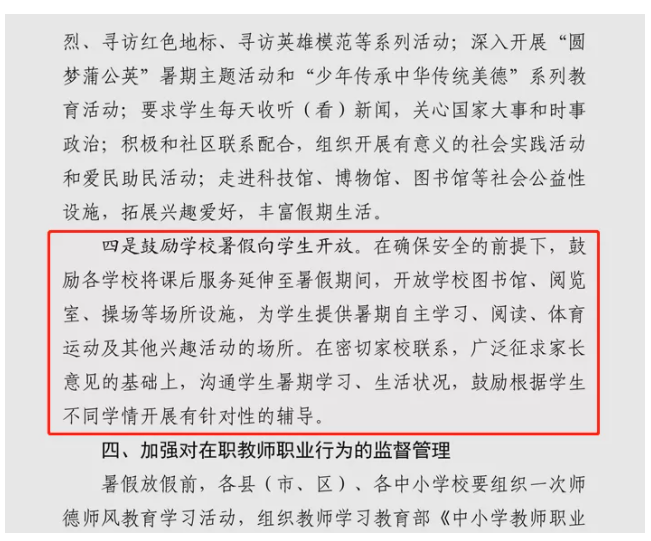 河南省安陽市教育局表示,充分考慮到暑假師生的身心狀況,每天時(shí)間總量不超過4小時(shí),總時(shí)間不超過四周。在放假后和開學(xué)前均留出10天左右的休息時(shí)間,讓老師和學(xué)生有放松期和調(diào)整期。