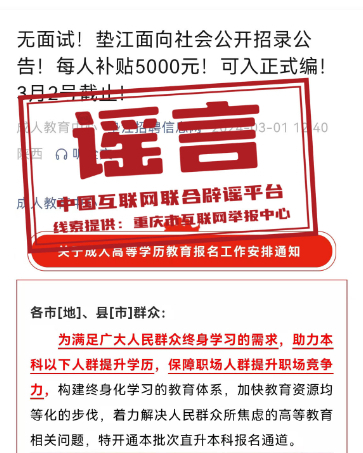真相:近日,“墊江招聘信息網(wǎng)”微信公眾號(hào)發(fā)布信息:“無面試!重慶墊江面向社會(huì)公開招錄公告!每人補(bǔ)貼5000元!可入正式編!”部分網(wǎng)民看到該信息后誤認(rèn)為,墊江面向社會(huì)以補(bǔ)貼形式招錄具有正式編制的公務(wù)人員,于是紛紛向墊江縣有關(guān)部門致電咨詢招錄情況。經(jīng)核實(shí),近年來,墊江未曾以補(bǔ)貼方式和不經(jīng)過面試招錄具有正式編制公務(wù)人員。該信息實(shí)則為成人學(xué)歷提升培訓(xùn)信息,而非正式編制公務(wù)人員招錄信息。墊江縣互聯(lián)網(wǎng)信息辦公室已依法對發(fā)布該信息的微信公眾號(hào)負(fù)責(zé)人進(jìn)行約談和教育批評(píng),指出虛假信息的危害性,并責(zé)令刪除相關(guān)信息。(來源:重慶辟謠)