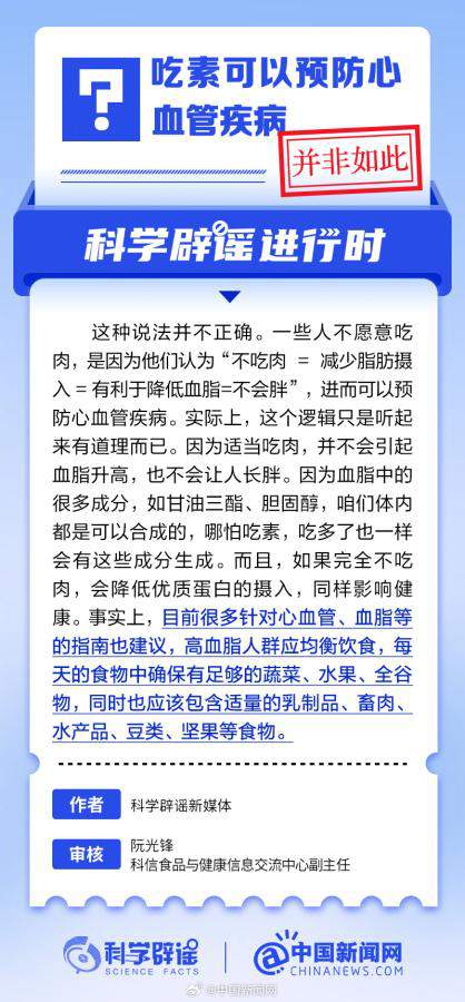 一些人不愿意吃肉,是因為他們認為“不吃肉=減少脂肪攝入=有利于降低血脂=不會胖”,進而可以預防心血管疾病。實際上,這個邏輯只是聽起來有道理而已。因為適當吃肉,并不會引起血脂升高,也不會讓人長胖。如果完全不吃肉,會降低優(yōu)質蛋白的攝入,同樣影響健康。(來源:@科學辟謠 中國新聞網(wǎng)微博)