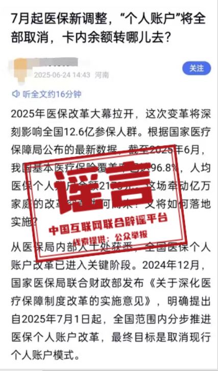詳情:近日,一篇題為《7月起醫(yī)保新調(diào)整,“個人賬戶”將全部取消,卡內(nèi)余額轉哪里去?》的自媒體文章引起較多關注。文中宣稱“從醫(yī)保局內(nèi)部人士處獲悉,全國醫(yī)保個人賬戶改革已進入關鍵階段”“自2025年7月1日起,全國范圍內(nèi)分步推進醫(yī)保個人賬戶改革,最終目標是取消現(xiàn)行個人賬戶模式”。