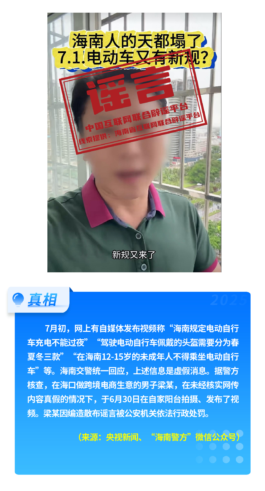 有人重新翻炒“醫(yī)?!畟€(gè)人賬戶’將全部取消”舊謠,故意歪曲醫(yī)保改革真實(shí)內(nèi)涵,嚴(yán)重誤導(dǎo)公眾對(duì)醫(yī)保改革政策的理解?!坝袑H松祥T(mén)服務(wù)激活醫(yī)保碼”,披著“公共服務(wù)”的外衣,實(shí)有詐騙之嫌和安全風(fēng)險(xiǎn)。憑空捏造“海南規(guī)定電動(dòng)自行車(chē)充電不能過(guò)夜、頭盔分三季”這一“奇葩規(guī)定”,以“新規(guī)”話術(shù),擾亂交通管理秩序。