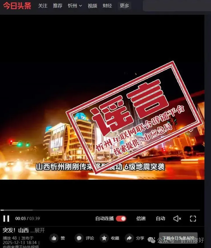 | 【辟謠臺(tái)】網(wǎng)傳“山西忻州遭遇6級(jí)地震”系謠言 |