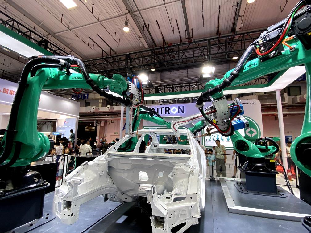 8月24日,在2024世界機(jī)器人大會(huì)展廳內(nèi),六軸機(jī)器人伸展鋼鐵手臂,為觀眾現(xiàn)場(chǎng)展示汽車自動(dòng)化焊接技術(shù)。