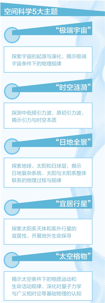 “太空格物”主題。主要是揭示太空條件下的物質運動和生命活動規(guī)律,深化對量子力學與廣義相對論等基礎物理的認知。優(yōu)先發(fā)展方向包括微重力科學、量子力學與廣義相對論、空間生命科學等。