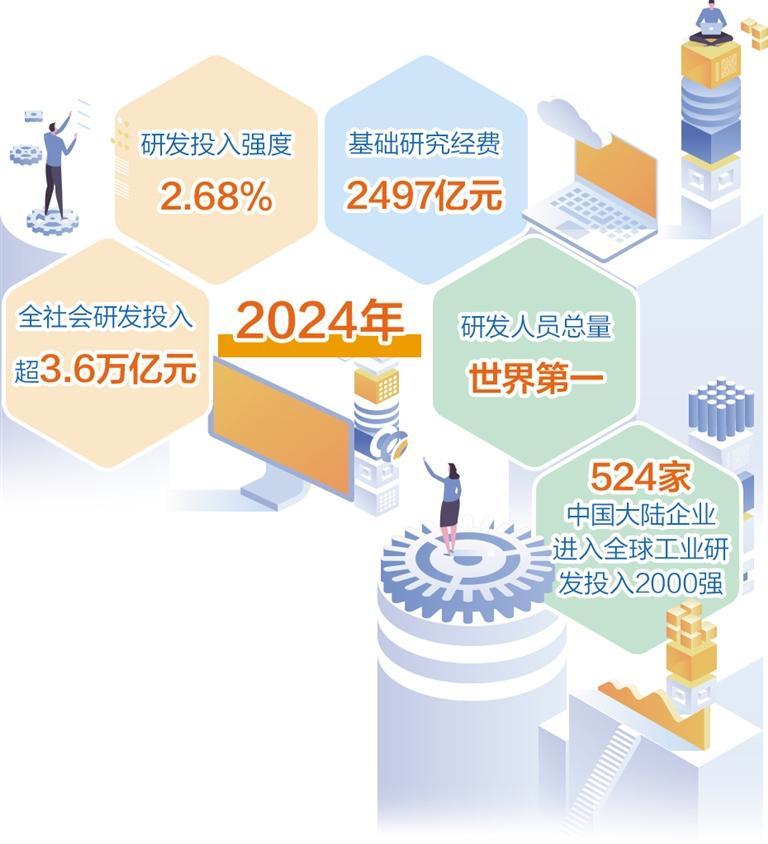科技投入持續(xù)增加。2024年全社會研發(fā)投入超3.6萬億元,較2020年增長48%;研發(fā)投入強度達2.68%,超過歐盟國家平均水平;研發(fā)人員總量世界第一?;A研究經(jīng)費達2497億元,較2020年增長超過70%,在量子科技、生命科學、物質科學、空間科學等領域取得一批重大原創(chuàng)性成果,高水平國際期刊論文數(shù)量和國際專利申請量連續(xù)5年世界第一。