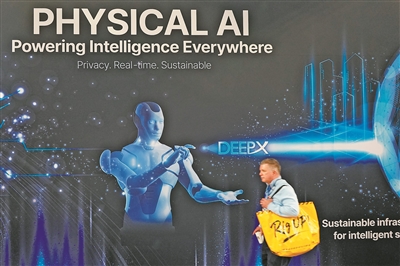 從制造業(yè)到醫(yī)療,從交通到家庭服務(wù),物理AI正以前所未有的深度融入并賦能各行各業(yè)。圖為一名男子在2026年美國拉斯維加斯消費(fèi)電子展上走過印有物理AI字樣的展臺(tái)。新華社發(fā)(曾慧攝)