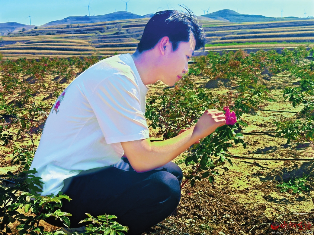他了解到食用玫瑰有銷(xiāo)路但縣域內(nèi)沒(méi)有種植。在與村“兩委”商議后建議村民種植食用玫瑰。這個(gè)想法得到了鎮(zhèn)黨委的認(rèn)可,先在圪坨莊村試種8畝、八角村試種2畝。試種初期出現(xiàn)了問(wèn)題,田里每日需人工澆灌,看管困難。他又建議村“兩委”鋪設(shè)管道建立滴灌系統(tǒng)和安裝監(jiān)控來(lái)實(shí)現(xiàn)精準(zhǔn)管理。他還與村“兩委”商議,利用光伏資金,設(shè)立工作崗位,從建設(shè)種植到開(kāi)花期日常維護(hù),用工量已達(dá)100余人次,村民的收入也隨著玫瑰花開(kāi)而增加。玫瑰示范園的建成,為農(nóng)產(chǎn)品深加工、發(fā)展鄉(xiāng)村旅游和補(bǔ)鏈月餅產(chǎn)業(yè)奠定了基礎(chǔ)。