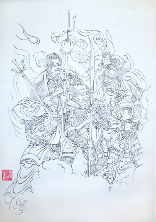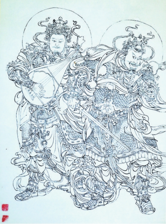 更令李向東醉心不已的是,壁畫中人物衣袖明明是靜態(tài),卻似乎被微風(fēng)吹動、卷起形成鼓動之勢,仿佛下一秒就要隨風(fēng)起舞。在靜止的壁畫中,畫師勾勒出搖動的扇面、飛舞的發(fā)絲,以及在眾仙家之間縹緲虛幻的云海,創(chuàng)造了靈動出畫的動態(tài)美。眾神佛道三五成群,看似錯落隔離,卻又遙相呼應(yīng),彼此相望,顧盼生輝,呼之欲出。在人物群像中,李向東對金剛座神的畫法最為推崇——面目粗獷,體格魁偉,毛發(fā)濃密,一雙銅鈴般的眼睛微微斜視,須眉怒張,威風(fēng)凜凜。身體重心偏向一側(cè),一手持金剛杵于肩頭,一手探掌護(hù)于胸前,全身肌肉緊繃,顯示出畫師對線條的熟練運用和高超的造型能力。