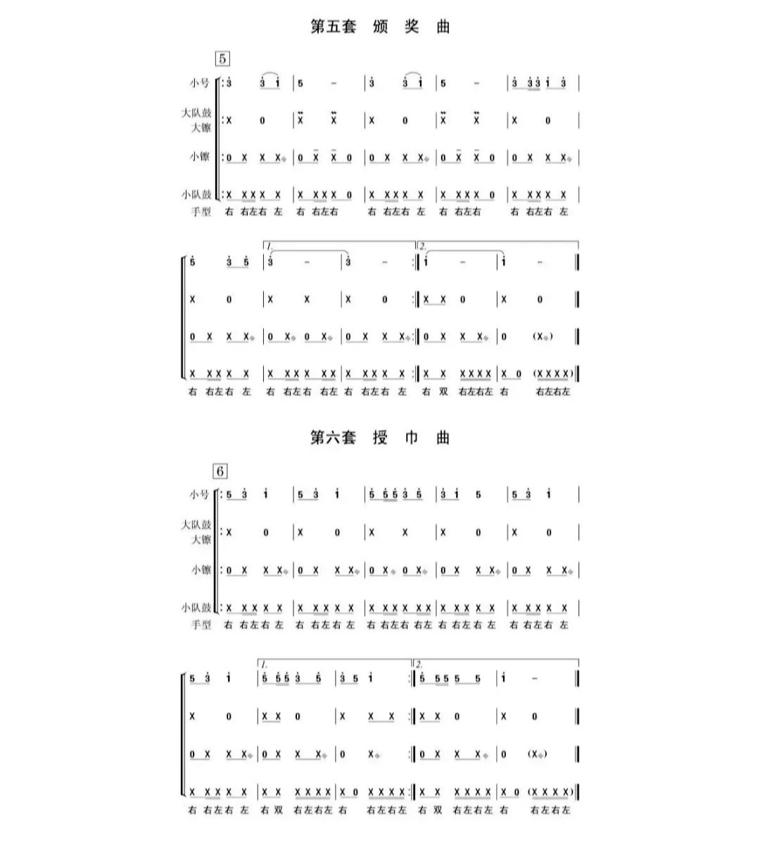 少先隊(duì)鼓號(hào)隊(duì)總譜除間奏鼓外共10套曲目,包括:開(kāi)場(chǎng)曲、進(jìn)行曲、出旗曲、退旗曲、頒獎(jiǎng)曲、授巾曲、檢閱曲、宣誓曲、迎賓曲、歡送曲。
