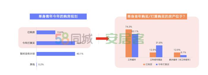 報(bào)告顯示,單身人群中有19.6%的人表示目前已購(gòu)房。他們之中,選擇在工作城市買房的單身青年占比74.3%,在工作城市周邊買房的人群占比12.9%,另有12.8%的已購(gòu)房單身青年回到家鄉(xiāng)城市(非工作城市)買房。