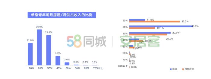 同時(shí),還有50.1%的單身青年目前租房居住,居住成本是一筆不小的支出項(xiàng),約65%的單身青年每月在房租/月供的開(kāi)銷占收入的20-30%。