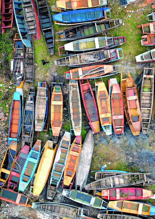 ▲湖北省宜都市枝城鎮(zhèn)白水港村一處“上岸”的漁船堆放點(無人機(jī)照片),這些收回的漁船將被集中拆解(2020年1月2日攝)。