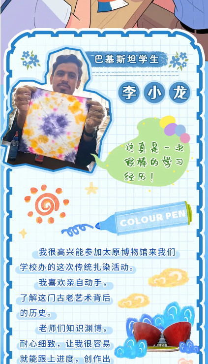 隨著國際博物館日臨近,太原市博物館開展聯(lián)動中外的“流動博物館”主題活動,來自太原科技大學國際教育學院近30名不同國家的留學生,參與中國非遺扎染技藝工作坊。
