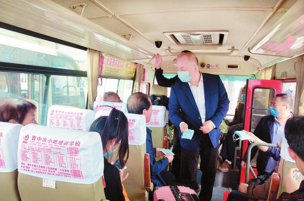 原平市交通運輸局加強對交通運輸企業(yè)、“兩客一危一貨”、旅游包車、網(wǎng)絡包車和重點路段的監(jiān)督檢查,嚴厲打擊“三超一疲勞”、非法載客、超員超限、疲勞駕駛和違規(guī)冒險行車等違法違規(guī)行為。在抓安全的同時,將疫情防控常態(tài)化,強調(diào)汽車站工作人員必須做好登記工作,督促乘客佩戴口罩。圖為工作人員在客車上為旅客發(fā)放口罩。( 劉建春 攝)