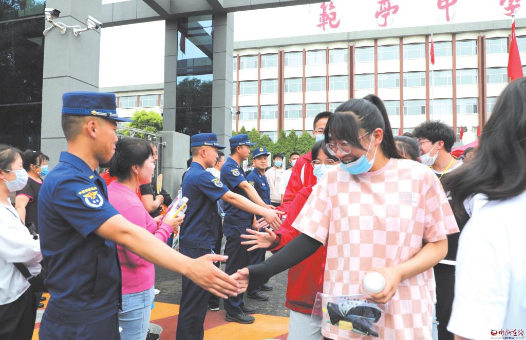 6月7日,全國高考開考,原平市2670名考生走進(jìn)考場,經(jīng)歷人生中的一次大考??忌诳紙錾险J(rèn)真答卷,社會(huì)各界營造良好的考試環(huán)境,為考生保駕護(hù)航。圖為在原平市范亭中學(xué)考點(diǎn),考生完成首場考試后走出考場,消防救援工作人員與他們擊掌,為他們鼓勁加油。(褚 震 攝)