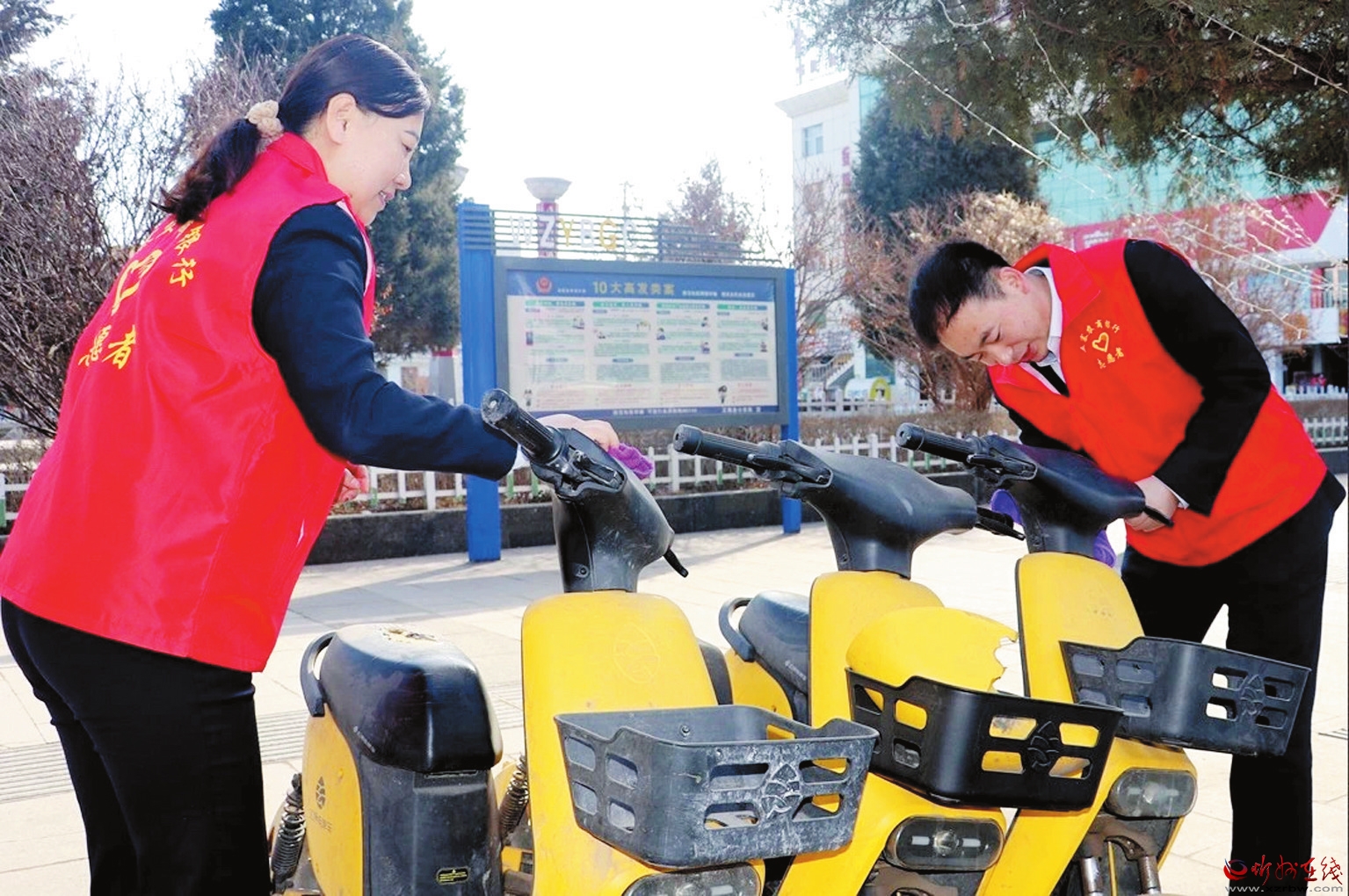 三月春風(fēng)拂揚(yáng)柳,雷鋒精神閃光芒。為進(jìn)一步弘揚(yáng)雷鋒精神,推動(dòng)學(xué)雷鋒活動(dòng)常態(tài)化,鞏固提升創(chuàng)衛(wèi)成果,營造和諧優(yōu)美環(huán)境,連日來,五寨農(nóng)商銀行機(jī)關(guān)黨員志愿服務(wù)隊(duì)組織開展了“擦亮共享單車,助力文明出行”志愿服務(wù)活動(dòng)。(張家源攝)