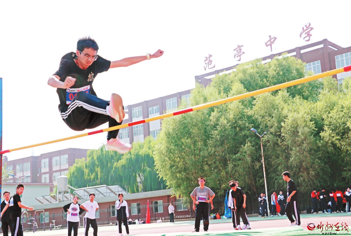 近日,2025年原平市中小學秋季田徑運動會在原平市范亭中學體育場舉行。圖為參賽選手在跳高比賽中大顯身手。 (