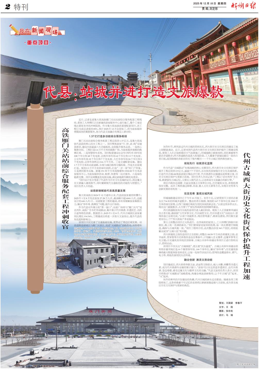 作為代縣對(duì)外展示的“第一窗口”,站前廣場(chǎng)將與“雁門(mén)關(guān)號(hào)”冠名列車、高鐵廣告專欄形成聯(lián)動(dòng),集中展示代州黃酒、非遺技藝、名勝古跡等特色資源。數(shù)據(jù)顯示,2025年1至8月,代州古城景區(qū)游客量同比增長(zhǎng)194.54%,工程建成后將進(jìn)一步放大文旅效應(yīng),提升代縣的知名度和影響力。