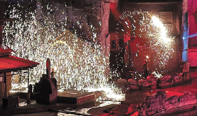 大年初七,晚上7點,山西省晉城市司徒小鎮(zhèn)的山水實景劇《千年鐵魂》準時開演。當臺上的幾位工匠將金黃色的鐵水一齊拋灑向天空,絢爛的鐵花在空中綻放,氣勢磅礴。觀眾的情緒也在此刻到達頂峰。
