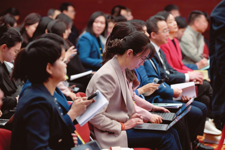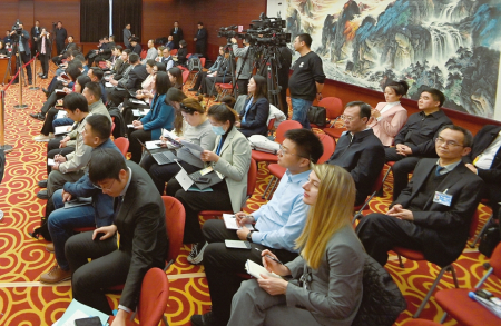 3月6日下午,山西代表團媒體開放日活動現(xiàn)場,記者踴躍提問、代表真誠回答,氣氛活躍熱烈。圖為中外記者齊聚。本報記者李聯(lián)軍 史曉波攝