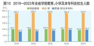 全年全省研究生教育招生2.1萬(wàn)人,在學(xué)研究生6.1萬(wàn)人,畢業(yè)生1.6萬(wàn)人。普通本科招生14.7萬(wàn)人,在校生55.1萬(wàn)人,畢業(yè)生13.8萬(wàn)人。職業(yè)本專(zhuān)科招生13.8萬(wàn)人,在校生41.2萬(wàn)人,畢業(yè)生12.5萬(wàn)人。中等職業(yè)教育招生13.8萬(wàn)人,在校生41.6萬(wàn)人,畢業(yè)生13.5萬(wàn)人。普通高中招生21.2萬(wàn)人,在校生67.8萬(wàn)人,畢業(yè)生22.1萬(wàn)人。初中招生37.1萬(wàn)人,在校生112.2萬(wàn)人,畢業(yè)生34.9萬(wàn)人。小學(xué)招生39.9萬(wàn)人,在校生231.8萬(wàn)人,畢業(yè)生37.9萬(wàn)人。特殊教育招生0.4萬(wàn)人,在校生2.0萬(wàn)人,畢業(yè)生0.4萬(wàn)人。學(xué)前教育在園幼兒91.8萬(wàn)人。(圖10)