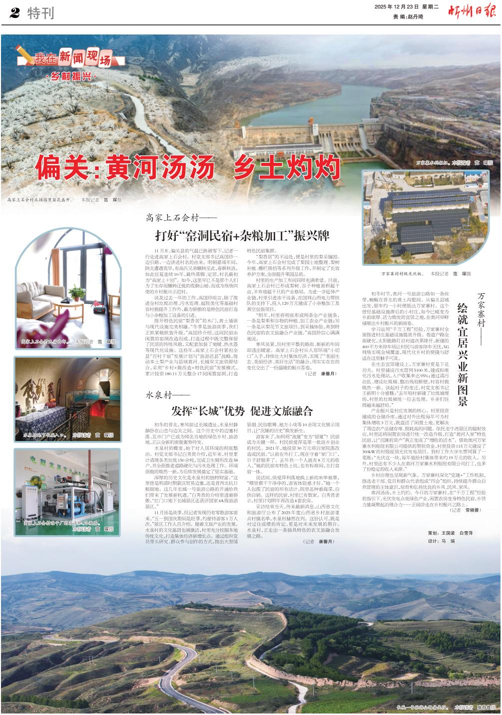 黃河湯湯,鄉(xiāng)土灼灼。今日的萬家寨村,在“千萬工程”經(jīng)驗的指引下,光伏發(fā)電點亮綠色產業(yè),閑置農房變身特色民宿,鄉(xiāng)賢力量凝聚起治理合力……正闊步走在鄉(xiāng)村振興之路上。