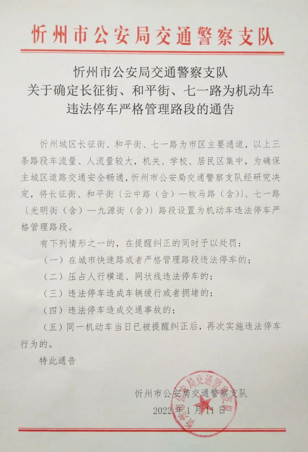 | 忻州市公安局交通警察支隊關(guān)于確定長征街、和平街、七一路為機(jī)動車違法停車嚴(yán)格管理路段的通告 |