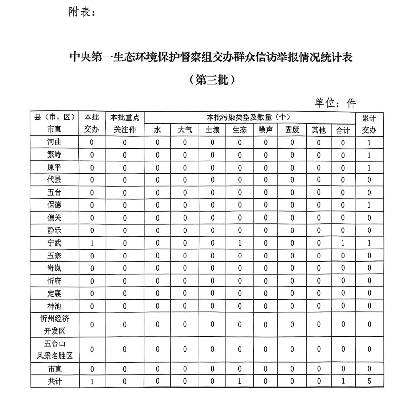 截止5月31日,中央第一生態(tài)環(huán)境保護(hù)督察組累計向我市交辦信訪件5件,其中重點關(guān)注件0件。交辦的信訪件中,涉及原平市1件、河曲縣1件、繁峙縣1件、保德縣1件、寧武縣1件;涉及生態(tài)環(huán)境問題5個,其中水污染問題1個、大氣污染問題1個、生態(tài)破壞問題2個、噪聲污染問題1個。