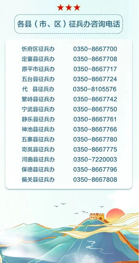 各縣(市、區(qū))征兵辦公室咨詢電話,請關(guān)注并進(jìn)入微信公眾號“山西征兵”點擊下方“聯(lián)系我們”中“各地征兵辦電話”查詢。