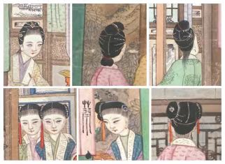 《大觀園圖》小姐、丫鬟的不同發(fā)型前后面,上列為小姐,下列為丫鬟 而寶玉在這幅三米多的橫披中出現(xiàn)了不止一次。對寶玉出現(xiàn)的次數(shù),前人有六次和七次兩種說法,許軍杰在對原畫作進(jìn)行仔細(xì)辨認(rèn)后,發(fā)現(xiàn)寶玉在原畫中共重復(fù)出現(xiàn)了八次之多?!皩氂裨诋嬜髦卸啻纬霈F(xiàn)。他頭戴懸著絳絨簪纓的束發(fā)嵌寶紫金冠,身著廣袖紫衫,外罩石青比甲,項上戴赤金盤螭瓔珞圈,圈上五色絲絳系著通靈寶玉?!痹S軍杰認(rèn)為,畫家用他串聯(lián)起了畫面的各個情節(jié)部分,且每處角度不同,表情各異,一一仔細(xì)繪出,力求符合情境,因此他無疑是繪制中的核心人物。