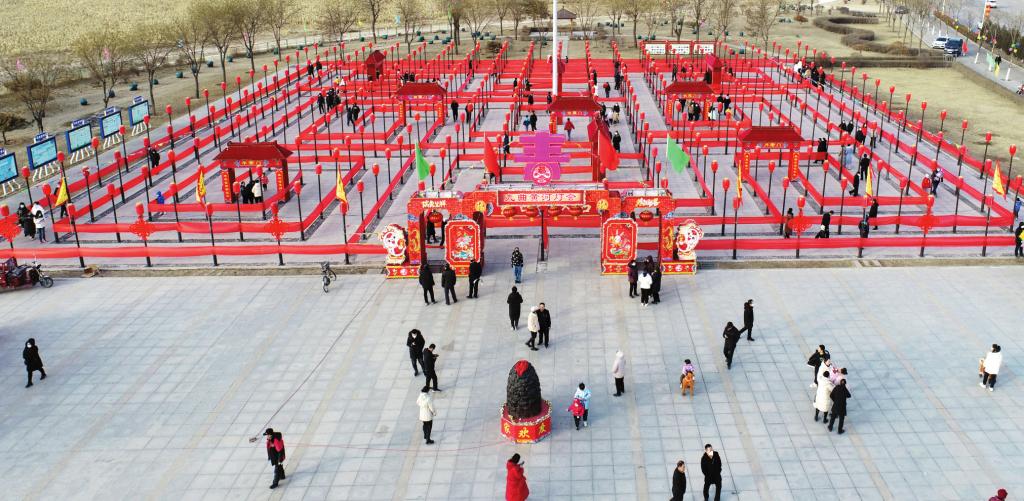 伴著舒緩的音樂(lè),一撥一撥的市民和游客穿行于燈陣中,或觀賞彩燈,或擊鼓祝福,或拍照留念。鴻運(yùn)門、豐收門、吉祥門、月老門、子孫門、狀元門、平安門、財(cái)源門、得勝門,每一道彩門都給大家以美好的祝福和期盼。使人們對(duì)未來(lái)生活充滿希望和憧憬,激發(fā)出奮力前行的勇氣和力量。