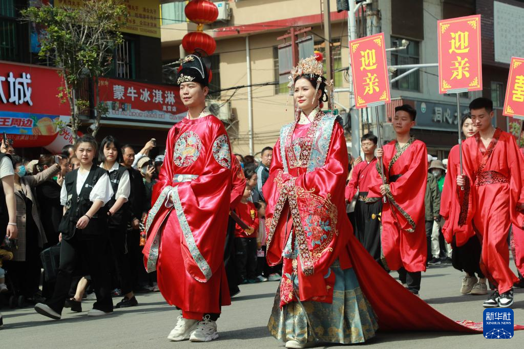 4月29日,漢服愛好者在葉縣葉公古街巡游表演。