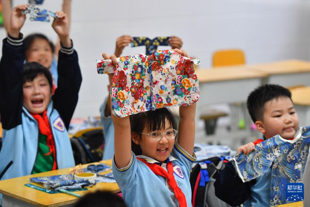 5月15日,在長沙市天心區(qū)紅衛(wèi)小學(xué),學(xué)生在傳統(tǒng)服飾設(shè)計課上展示作品。