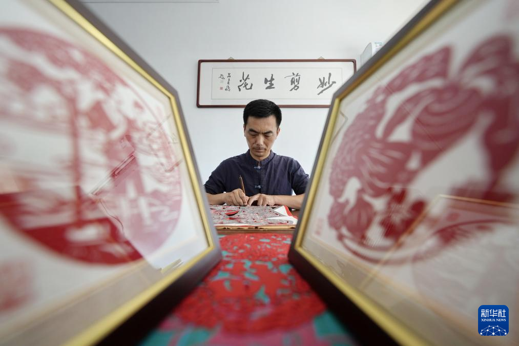 9月16日,剪紙藝人在玉田縣“非遺會客廳”工作室內(nèi)創(chuàng)作剪紙作品。
