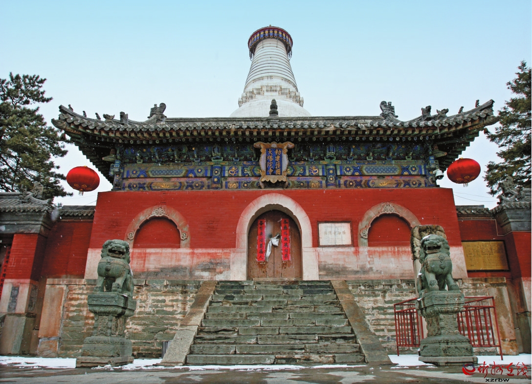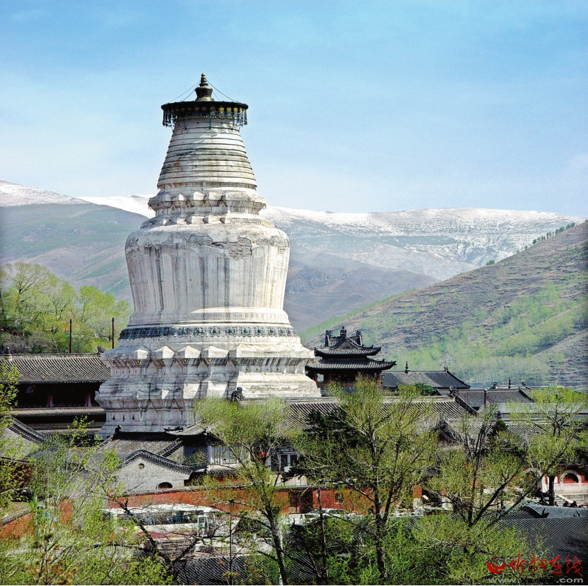 大白塔全名釋迦文佛真身舍利寶塔。該塔在元大德五年(公元1302年)由尼泊爾匠師阿尼歌設(shè)計(jì)建造,塔身用石頭砌成。地上部分高度為56.37米,比北京北海大白塔高20.4米,故有“清涼第一圣境”的美譽(yù)。大白塔之東,一進(jìn)三院。前院為都綱院,中院為錢糧庫(kù),后院為方丈院。