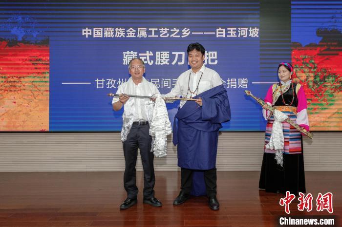 而甘孜州民族民間手工藝非遺協(xié)會(huì)會(huì)長(zhǎng)、金屬鍛造傳承人日多向杭州工藝美術(shù)博物館捐贈(zèng)了來(lái)自中國(guó)藏族金屬工藝之鄉(xiāng)——白玉河坡的兩把藏式腰刀。德格印經(jīng)院雕刻負(fù)責(zé)人、雕版印刷非遺傳承人江永扎巴則捐贈(zèng)了兩件珍品:一件是大藏經(jīng)《甘珠爾》佛像全集版畫(huà),共有58張,內(nèi)容包括208個(gè)佛像和9個(gè)塔的圖像,共計(jì)217個(gè)圖像;另一件是《千手千眼觀音》唐卡印版圖畫(huà),這是收藏在德格印經(jīng)院里面最早的佛像印版之一,距今四百多年。